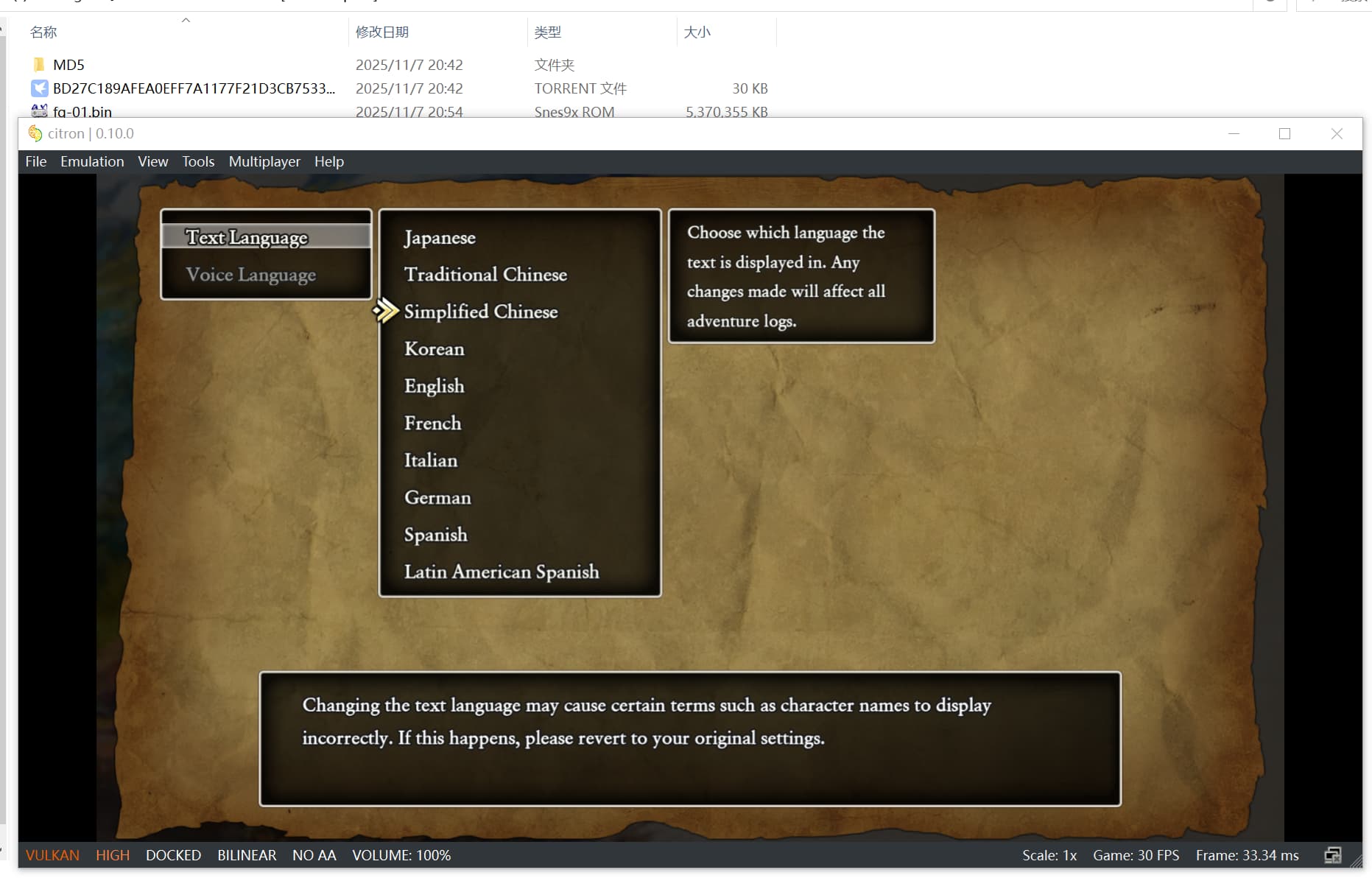 中文设置 打开模拟器设置将键盘映射完毕 在游戏菜单点x(模拟器的x键 不是键盘的x 按照你的键盘设置)选择simplified chinese确定即可