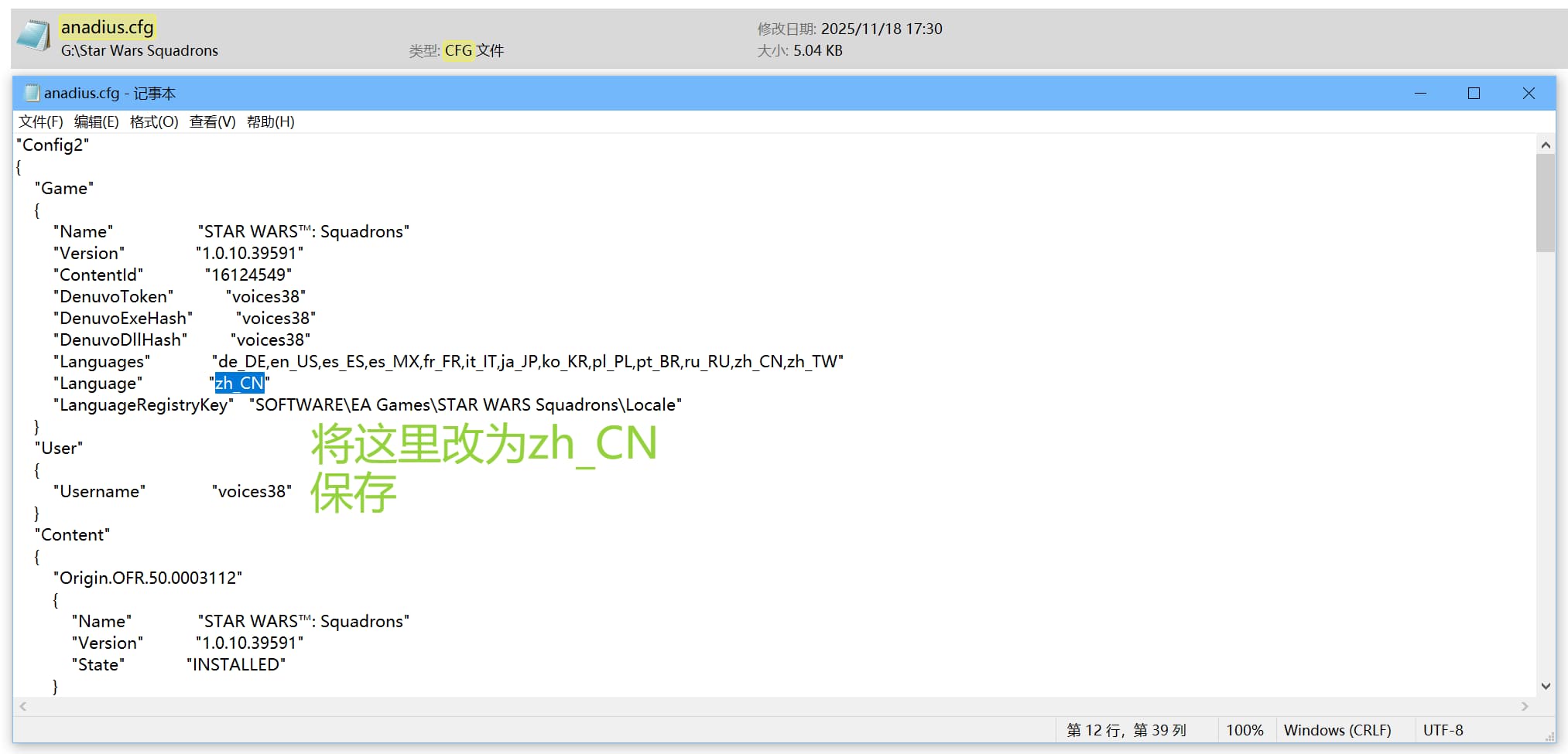 中文修改 在游戏目录右上角搜索anadius.cfg 打开后将language后面改为zh_CN 保存 参照上方图片即可