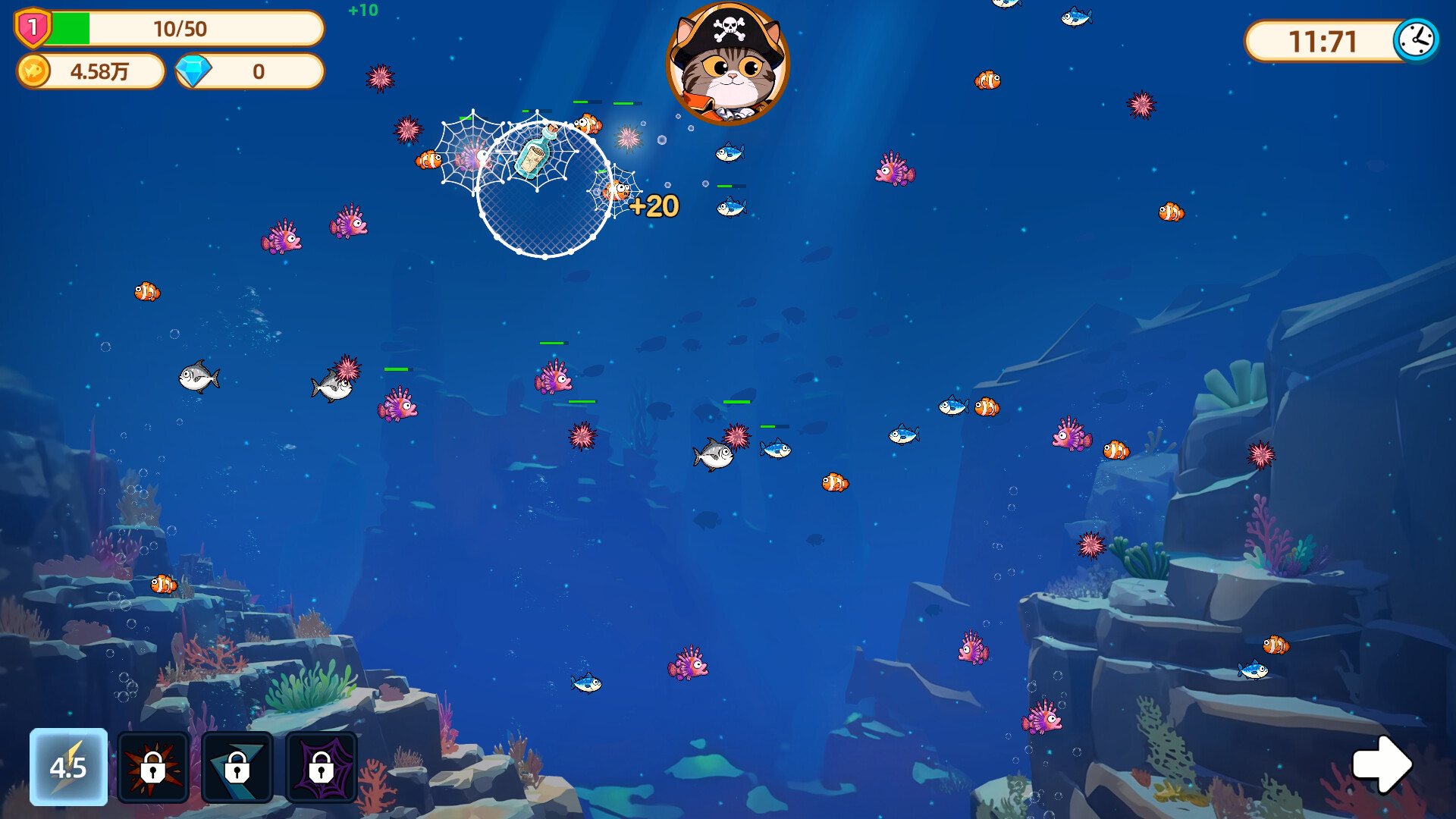 这是一款捕鱼主题的增量游戏,休闲、轻松、解压。你将与猫船长一起探索环球渔场,捕获海鱼、收集资源、学习天赋、强化威能、升级技能、收集藏品,并在庞大的天赋树中使用金币解锁永久升级